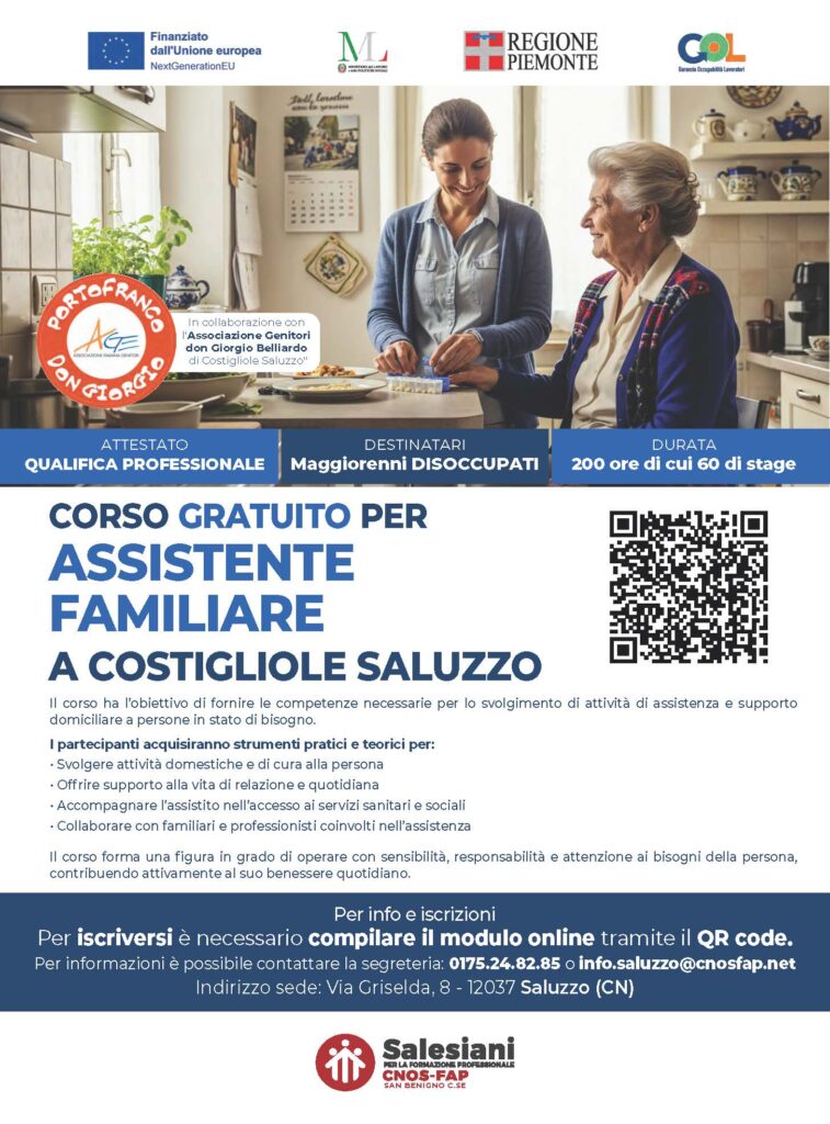 Quest’anno si è deciso, all’interno del bando GOL della Regione Piemonte coi fondi dell’Unione Europea, di fornire anche competenze più specifiche e che possano dare a queste persone anche una maggior possibilità di inserimento nel mercato del lavoro, ed abbiamo ottenuto l’autorizzazione all’erogazione a Costigliole Saluzzo di un corso GRATUITO (perchè finanziaro dalla Regione) di qualifica da ASSISTENTE FAMILIARE .
